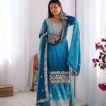 Women’s Chinon Silk Sequence With Rivet Moti Work Straight Kurta With Sharara and Dupatta Set